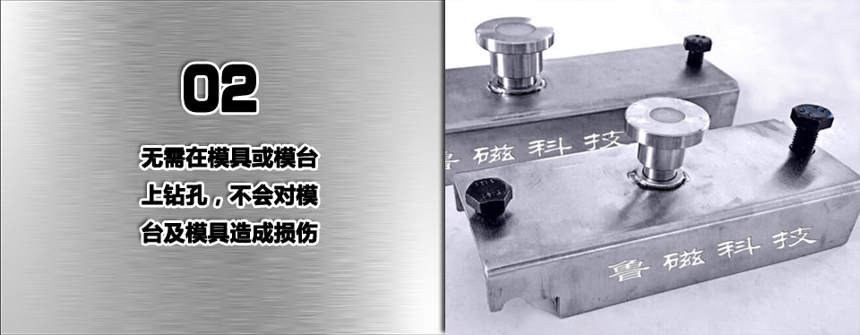 3.以强磁芯吸附模台固定模具,无需在模具或模台上钻孔,山东鲁磁固定磁盒,不会对模台及模具造成任何损伤,大大提高其使用寿命;传统工法:需在模具或模台上冲孔后用螺栓固定,造成不可逆转的损伤,久而久之造成构件表面凹凸不平,模台及模具的使用寿命短,成本摊销高。